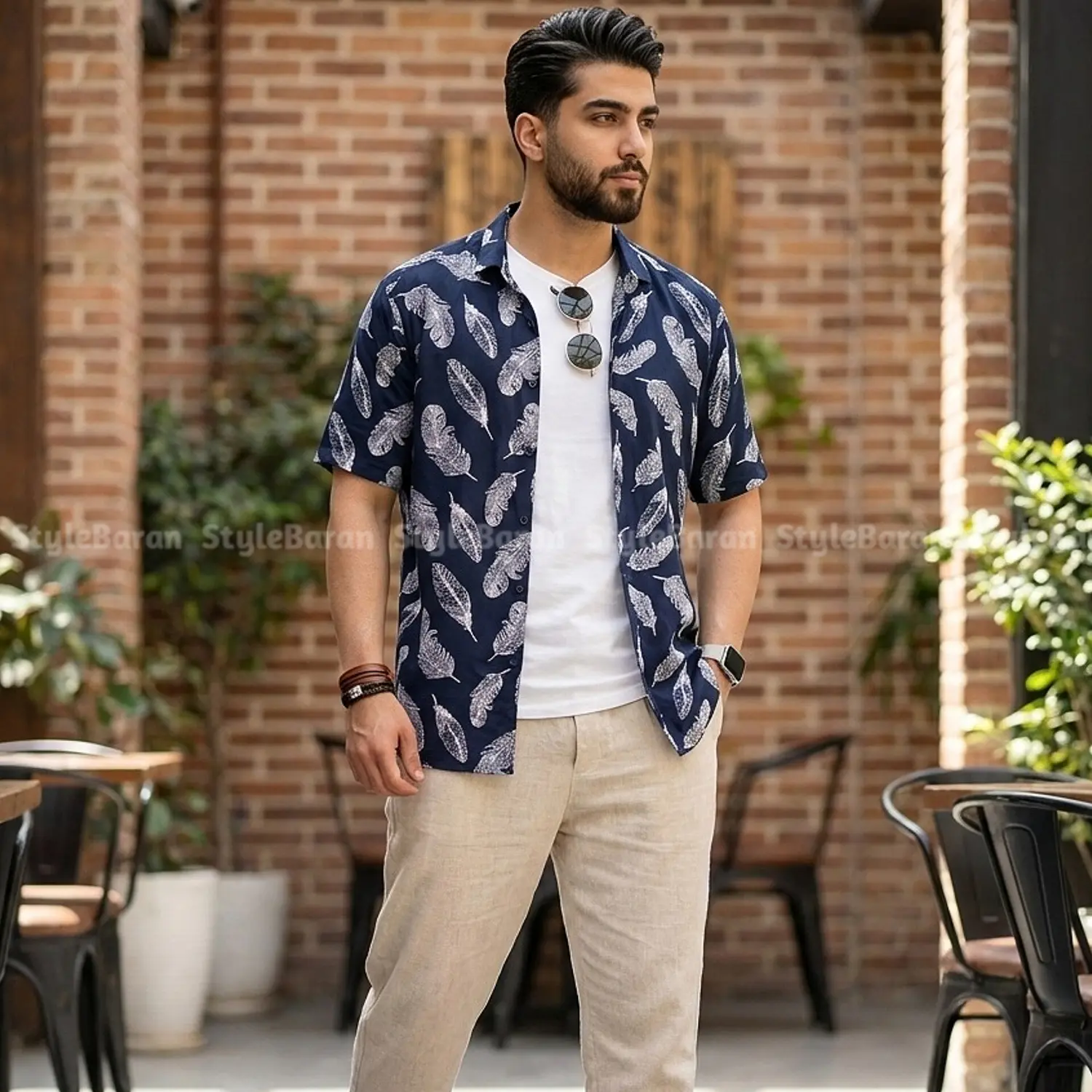 اگر به دنبال پیراهنی هستید که استایل شما را متمایز کند، پیراهن مردانه هاوایی پر سرمه ایی بهترین گزینه است. این پیراهن با طراحی منحصر به فرد و رنگهای زنده، برای تمامی موقعیتها از تعطیلات ساحلی گرفته تا مهمانیهای شبانه، ایدهآل است.
